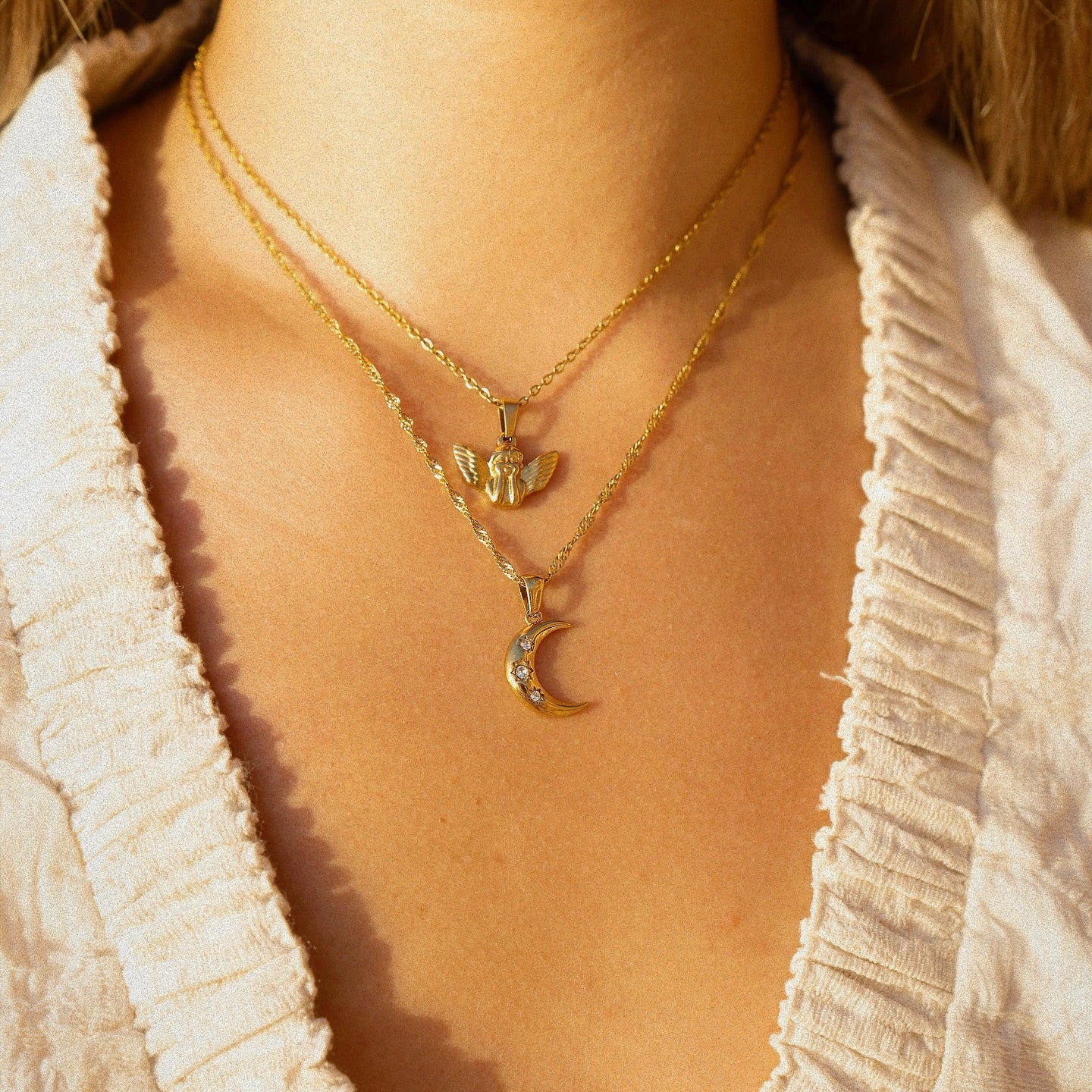 Nos bijoux sont conçus en acier inoxydable, un matériau qui ne déteint pas et ne change pas de couleur au contact de l’eau ou de la peau.