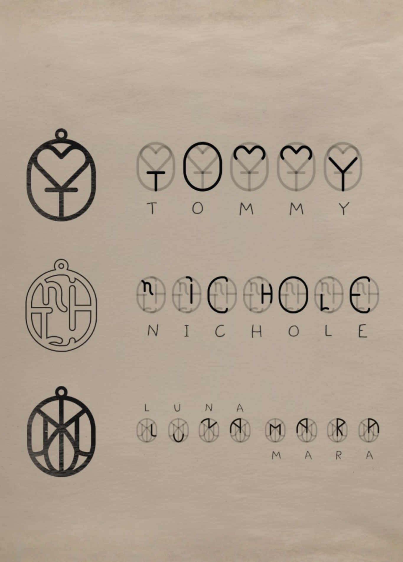 Par exemple, le prénom “AMANDA” contient trois fois la lettre A. Si le designer le juge pertinent, la lettre A pourra être intégrée une seule fois dans le design final.